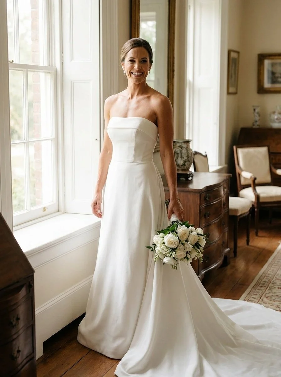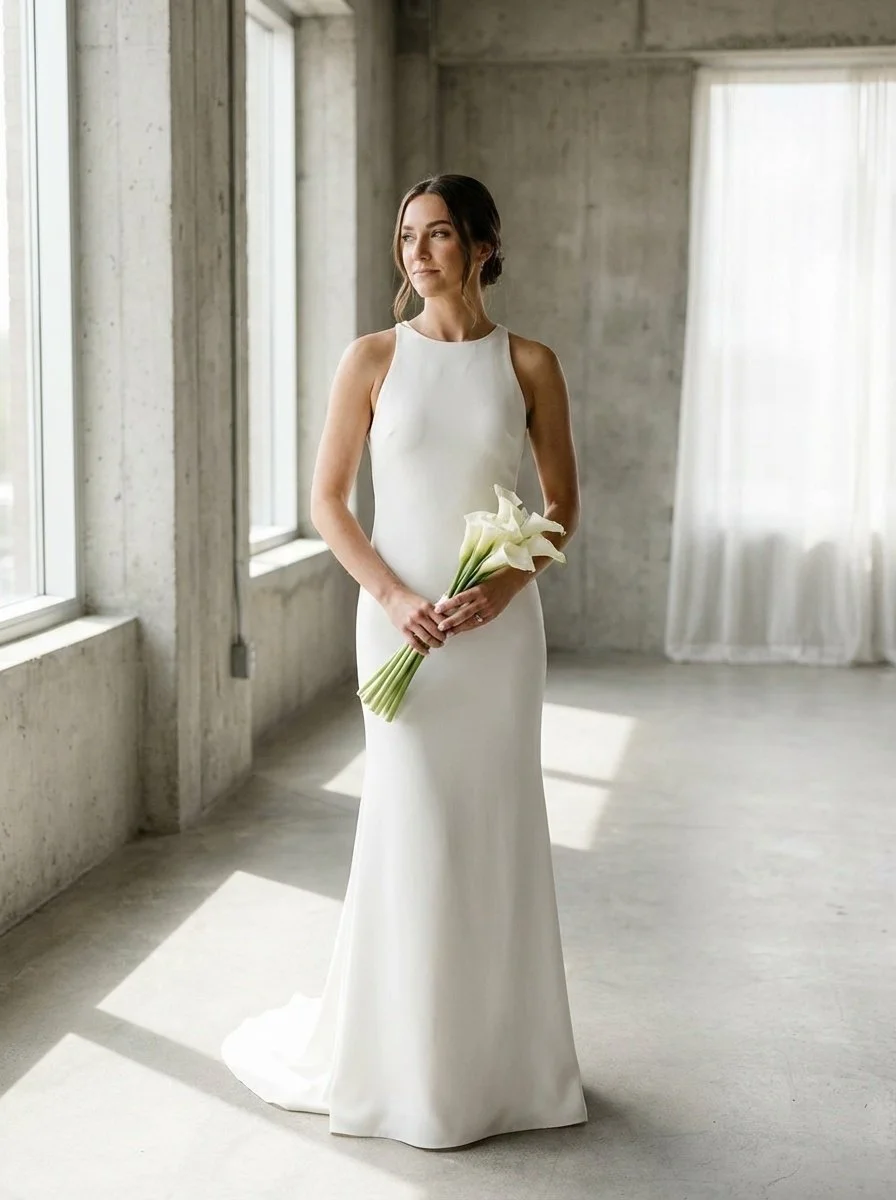 The Trend: Sleek, body-hugging fabrics like crepe, silk satin, and matte mikado are huge in 2026. These wedding dresses offer comfort-focused engineering with softened internal structures.