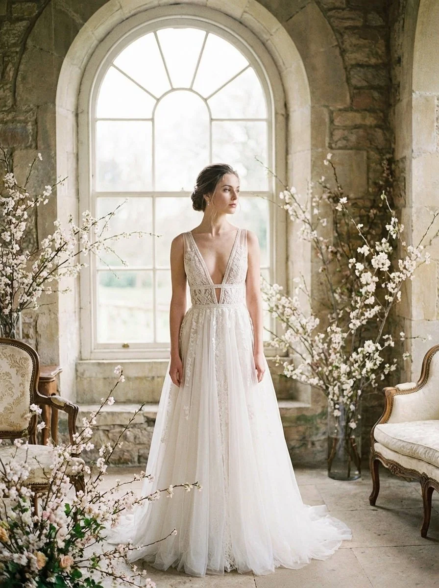 The Trend: The basque waist wedding dress is everywhere in 2026. This vintage-inspired silhouette features a V-shaped dip at the waistline that elongates your torso and creates a flattering hourglass shape.