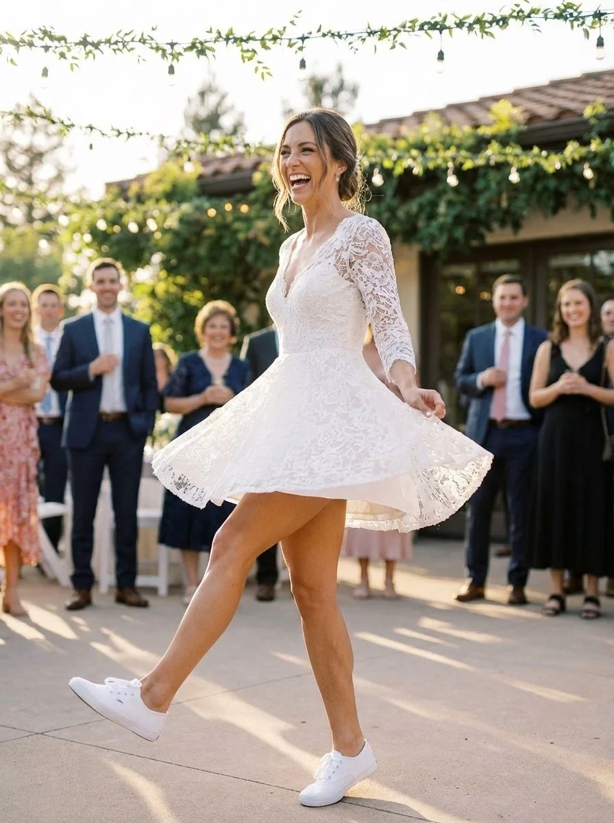 The Trend: Short wedding dresses and front-facing bows are perfect for brides who want playful, modern looks. These styles showcase legs and draw attention with bold details.